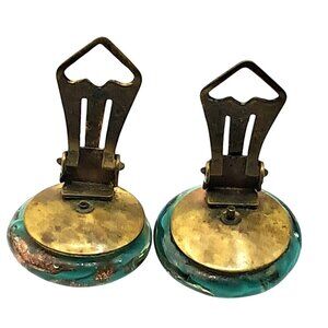 Elegant vintage Murano glass earrings with green and gold glittery swirls. These clip-on costume jewelry pieces are perfect for adding a touch of Italian flair to any outfit. The signature is a bit difficult to read but it looks like "Made Italy" to me. They measure just about 3/4" across.