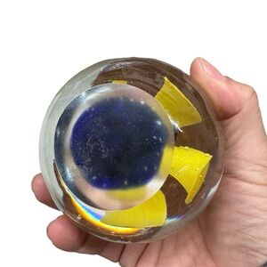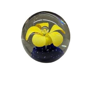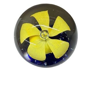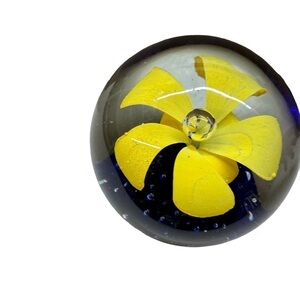 Vintage Murano Glass Paperweight Yellow Flower Blue Base Controlled Bubble