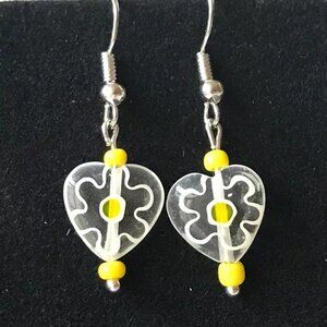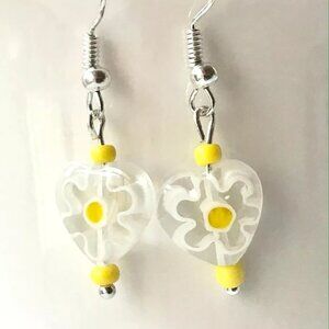 Vintage Murano Millefiori Heart Glass Earrings Bead Yellow White Silver Plated