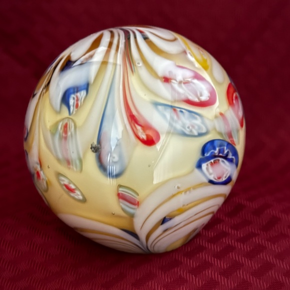 Vintage Murano Style Art Glass Swirl Millefiori Blue Red Yellow 4” Ball Paperweight DS3 ~ Heavy ~ Excellent used condition.