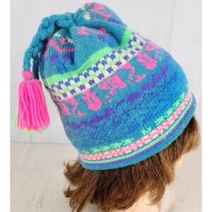 Vintage Murray Markley Wool Knit Ski Hat Neon Tassel Beanie Canada 80s 90s