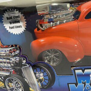 Vintage Muscle Machines 41 Willys Coupe Orange 1:18 Scale, Real Steel Braided Fuel Lines, Manufactured in 2002 in China, New Open Box, has not been removed from the box or played with.