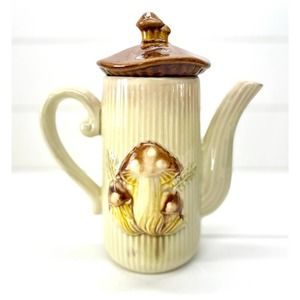 So cute and all the rage in the 1970's. This is a ceramic teapot or coffee pot in a mushroom print.