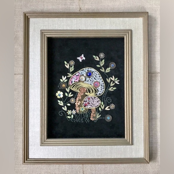 Condition: A few beads and sequins have come off. Some damage to butterfly wing. Minor nicks, scuffs, and scratches on frame. Some discoloration and staining on back. Velvet collects lint pretty easily.