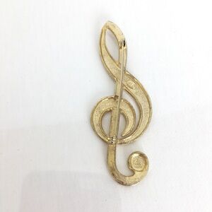 •One gold tone treble clef music note brooch pin, with shiny rhinestones. 3 1/4” x 1 1/4”