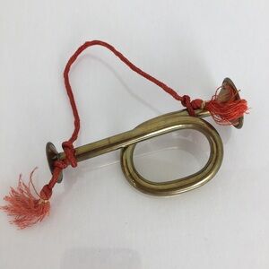 •One brass horn instrument ornament with red tassel cord hanger. 4” x2”