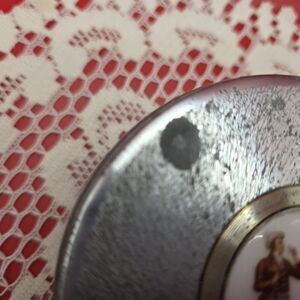 Beautiful round musical powder box. The top features a porcelain enlayed picture of a man & a woman.