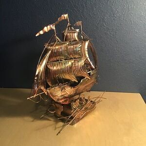The ship is either bronze or brass. I'm not sure which. Even though I have the box, it doesn't have any information on it other than it's a Musical Sailing Ship.