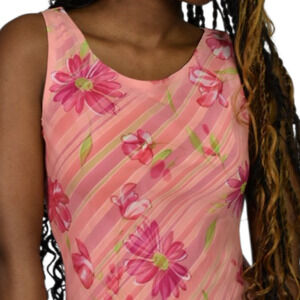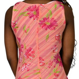 Vintage My Michelle 90s dress FEATURES a slip silhouette and a floral chiffon fabric with angled stripe pattern lining. Round neckline. Angled hemline with ruffle tier. Knee length. Wide shoulder straps. Pullover.