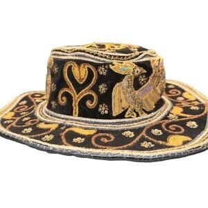 Add a touch of exotic flair to your wardrobe with this vintage Burmese Kalaga floppy hat! Featuring intricate phoenix sequins and delicate embroidery, this unique piece is sure to turn heads.
