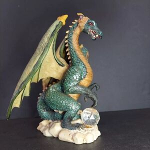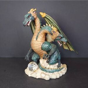 This is a striking double headed dragon figurine cast in resin. Features a colorful dragon crouched over a crystal ball.
