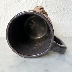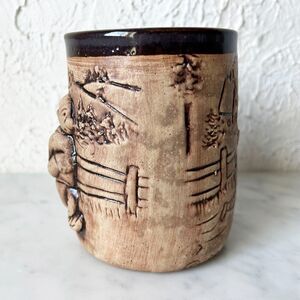 Vintage Eastman Pottery Mug. Brown clay mug shows a jogger and runner in relief running in the countryside. Signed NA Eastman, 1980. Excellent vintage condition.