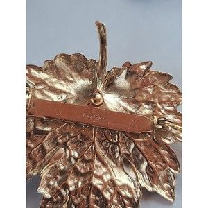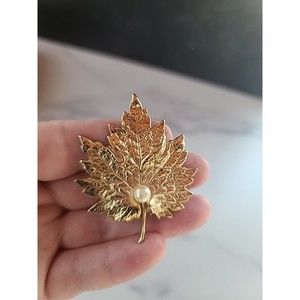 This is a vintage Napier gold tone metal Maple Leaf shaped brooch with a faux pearl.