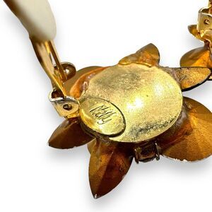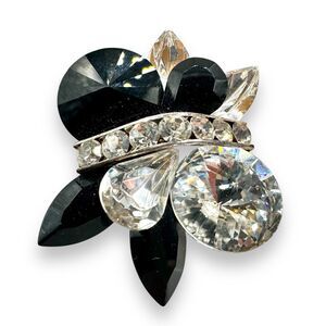 Rare signed Nelly clip earrings featuring a bold cluster of faceted black, clear Rivoli, teardrop, and navette rhinestones. Beautiful sparkle and sculptural shape—eye-catching yet timeless. Measure approx. 1.5” x 1.25”. Good vintage condition with some light wear and glue residue on the back (see photos).