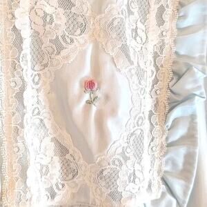 Perfect condition, straight from 1980s. Felt backed satin, lace ruffle detail, mother of peart buttons, tiny satin roses...princess length..long, vintage classic modesty sleepwear.
