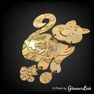 Vintage articulated gold tone brooch featuring a cat with a dangling kitty and ball.