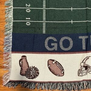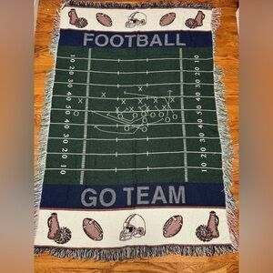 Score a vintage touchdown with this cozy NFL football field knit tapestry blanket! This unbranded vintage gem features bold "Go Team" and "Football" lettering across a green multicolored field print, finished with classic fringe edges. Perfect as a game day throw, man cave decor, or unique tailgate accessory. In GREAT condition and ready to ship fast!