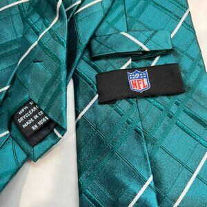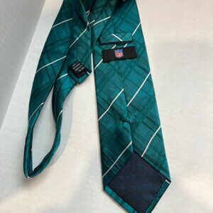 Vintage Green NFL 100% Silk Tie featuring white diagonal stripes, textured crisscrossed green stripes and the Philadelphia Eagles Logo. Made in China. Very Good vintage used condition.