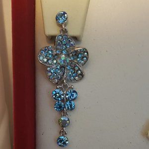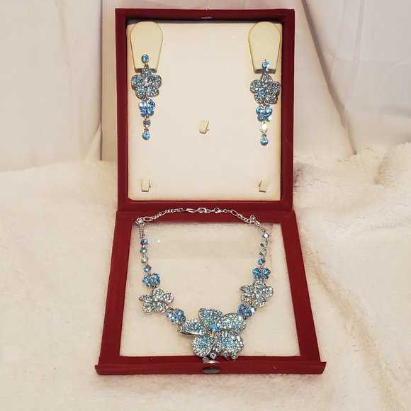 This is a unique piece. Nothing else like it on the internet. Great for a special occasion. It comes in a red velvet box. These have never been worn. The Earrings have a 3" Drop. It Has Flowers and Butterflies. Silver toned.