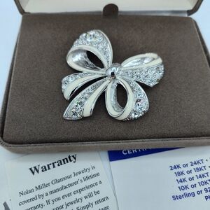 Elegant Nolan Miller silver bow brooch, perfect for adding a touch of glamour to any outfit. Features a stunning silver finish.