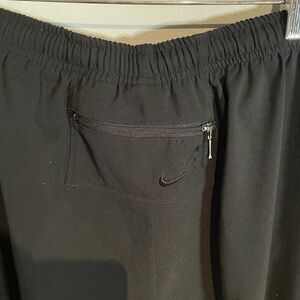 Vintage Nike track pants in black, size M. Made of lightweight nylon with a pull-on closure and a 32-inch inseam. Featuring a unique back middle zip, these 80s and 90s-inspired pants are perfect for activewear during winter, summer, and spring. The tapered leg style and regular fit provide comfort for activities like cycling, basketball, and cross-training. Machine washable for easy care.