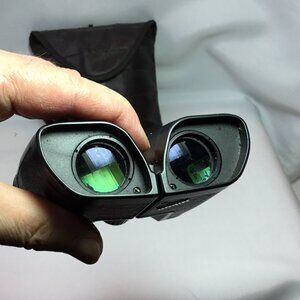 This item is in good used condition. The rubber cap on the right view is missing. Some surface scuffs to the body. The lens surfaces could use a good cleaning. No scratches to the lenses was noticed. These are very good compact field glasses. The case is pretty rough, with the exterior coating starting to peel. The interior of the case is very clean. Please review all of the photos for condition. This item is cross posted.