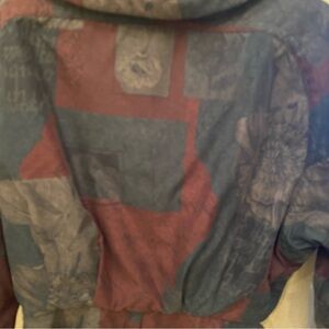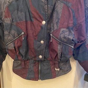 Pre-owned in great condition with no rips or stains but tag inside is faded. Women’s vintage floral patterned ski jacket. Burgundy, green and beige color mixture. Has nice silver buttons and hardware. Zipper and snap button closure. There’s no size tag but fits like a size small. Please check measurements. I believe it’s missing the hoodie. Comes from smoke and pet free home.