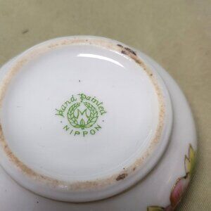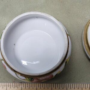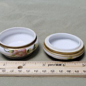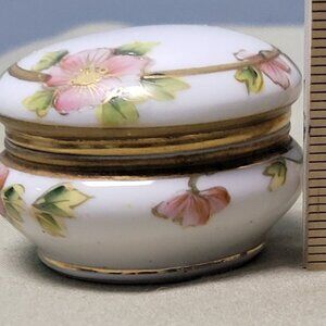 This is a vintage NIPPON hand-painted porcelain powder/trinket box. No hinges. No cracks or chips. Excellent condition. Pink floral theme.