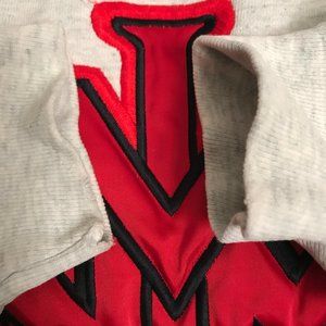This pullover is in great condition for being 30 years old! This was purchased at the New Mexico Military Institute bookstore during the school's centennial celebration in 1991. It is a men's XL, but looks great on anyone in that cozy, over-sized 90's look. The NMMI insignia and bronco are beautifully appliqued on, and the red is as vibrant as the photos show. The base sweatshirt is a heathered gray high-quality Fruit of the Loom Super Cotton pullover that was made in the USA. There one tiny stain in the middle of the back (see photo), and there is some slight fraying of the cuffs. It is 28 inches from top of the shoulder to the bottom of the waistband, 25 inches across from arm pit to arm pit, and the sleeves are 23 inches long. NMMI just won the national JUCO football championship, this would be a treasure to any Broncos fan or former cadet.