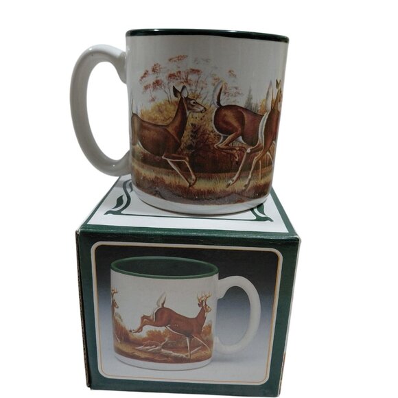 This ceramic mug showcases a vivid leaping deer design, paired with a green interior and rim. Suitable for collectors or wildlife enthusiasts.