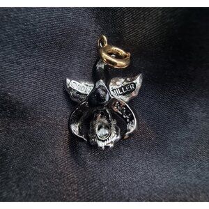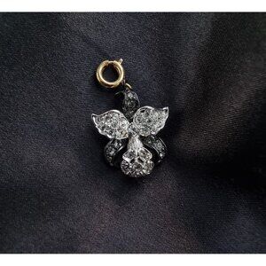 Unveiling a touch of vintage elegance, this enchanting orchid charm whispers the name of Nolan Miller. Crafted from a beautiful combination of oxidized gunmetal and bright silver-toned metals, the charm captures the delicate form of a blooming orchid. Sparkling rhinestones add a touch of glamour, while the signed hallmark on the back guarantees authenticity. This pre-owned treasure measures approximately 1.25 inches in length and 0.75 inches in width, and is in excellent condition. Attach it to your favorite bracelet or necklace for a touch of timeless floral charm, reminiscent of the iconic Nolan Miller style.