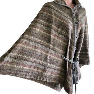 Vintage NPC Fashions Poncho Womens One Size Gray Brown Striped Hooded Wool USA 70s
