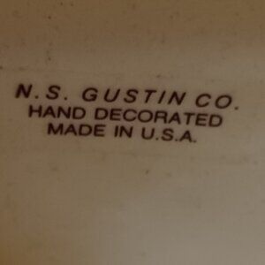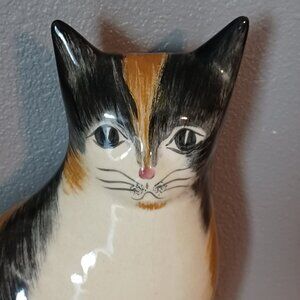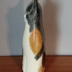 Vintage N.S. Gustin Ceramic Cat is probably form the 80s. The statue is one foot tall. It was hand painted in the USA. It is a calico cat. There is a hairline fracture on the chest.