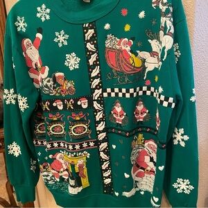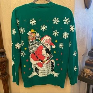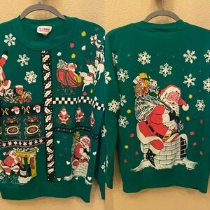 Pre-owned in great condition with no rips or stains but has a loose threading on the back left neck area as shown in picture. Fun vintage front and back Christmas Santa Claus graphic sweater. Comes from smoke and pet free home.