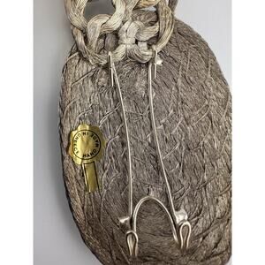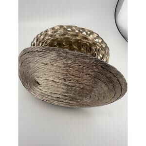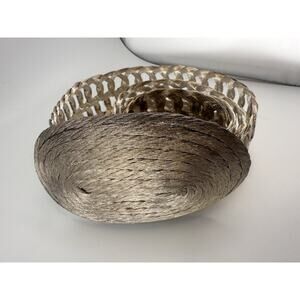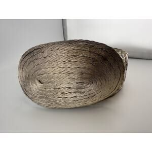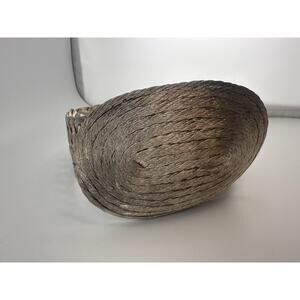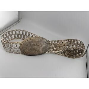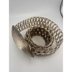 Vintage 1960’s metallic gold champagne with silver hue. The braided material has a shiny, reflective quality, suggesting it’s made from or coated with a metallic material, giving it that silvery or slightly golden sheen depending on the lighting. Terrific waist belt made of woven brass wire. Woven into an infinity / figure 8 / lemniscate design. Excellent vintage condition. Never worn. New w out tags. Stored in bag.