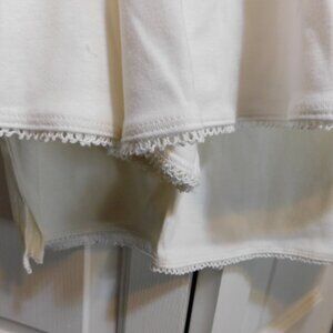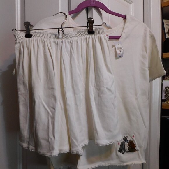 From Disney: New with tags, but vintage. Lady and the Tramp pajamas in size L/XL. All white cotton with picot trim on the bottom edge of top and top and bottom of shorts. 3 snaps at the neckline and ribbon drawstring. Embroidered Lady and Tramp on front bottom corner of top. Bust measures 43" and length is 23". Elastic waist measure 25" to 36". Inseam is a tiny 2" while overall length is 15". Excellent unused condition.