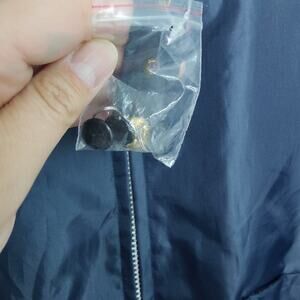There is a bag with buttons to attach at the collars so you can choose between black or gold. One of the tabs has lost it's temporary stitch that holds it down until the button is attached. Won't matter once the buttons are attached.