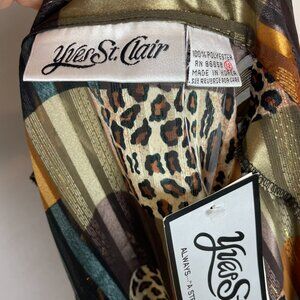 Vintage deadstock Yves St. Clair semi-sheer women’s blouse with geometric animal print design in brown, olive green, orangish, and black. Metallic threads running vertically along with the stripes. Button-up front. Long sleeves.