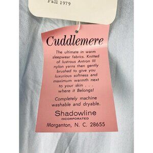 Deadstock vintage nightgown by Shadowline from their Cuddlemere line. This was a store sample from fall 1979. Pretty, light blue color with navy blue trim. Long sleeves, v-neck with tie.