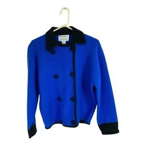 Vintage Wool Sweater Jacket by Knitting Needles. Beautiful blue with black buttons and trim.