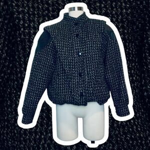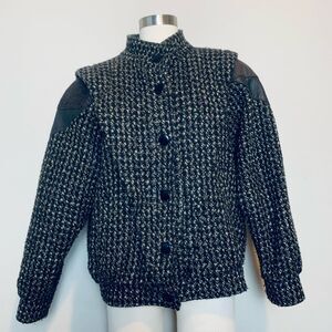 Vintage NYC Girl patterned wool blend and leather patched snap button down bomber style coat. Lined. Thick.
