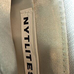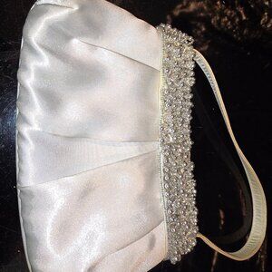 The Vintage NYT Lites White Satin Clutch with Jeweled Top is a stylish and elegant handbag perfect for formal occasions. The white satin material adds a touch of sophistication, while the jeweled top gives it a luxurious look. This 8" x 5" clutch exudes eveningwear or wedding day style and is a timeless accessory that will complement any outfit. There is a white satin fabric strap. The top features small silver seed beads encasing larger silver "pearl" beads. The zippered top opens to a white satin interior with a small pocket. The piece is in almost new condition.