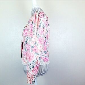 Beautiful floral vintage blazer with gorgeous pink flowers and white Guipure lace trim. Perfect for Spring! Very good pre-owned condition.