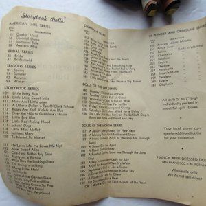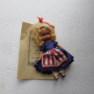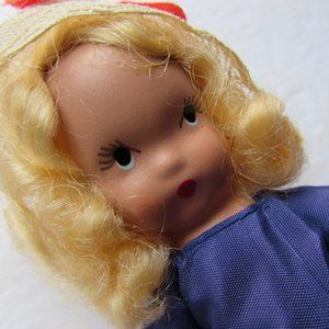 Sweet Nancy Ann Going a Milking doll (#126). From the 1940's Storybook grouping. She wears a bright blue dress with red/white striped apron. Her pretty blonde curls host a lacy cap. She wears pantaloons. Her shoes are painted black. Our understanding is that this model is a later date using the 126 mold. She is marked on the back, but we could not read it. Included is a 1943/1944 pamphlet titled Nancy Ann Story Book Doll "Wee Dolls for Wee Collectors" Our information was gleaned from Nancy Ann Storybook Dolls 1936-1947 by Pardee and Robertson