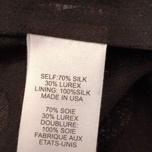 Made in the USA. Elegant black silk blouse with gold lurex polka dots. Sparkly button detail. Full shape. Cut in shoulders with silky tie at back neck. Size 8 measures 42 at chest. 58 at bottom hem. 30 long from shoulder to hem. Perfect for any occasion. Stylish and chic design.
