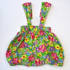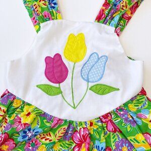 Adorable spring Nannette romper with green floral print & tulip appliqués on the front. Elastic waist and leg holes with buttons on both shoulder straps for easy on & off. This piece is so cute and would be adorable for Easter! Very good vintage condition - no stains, holes or fading. Size 12 months.