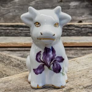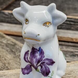 Vintage Nantucket White Porcelain Cow Figurine w/ Springtime Bouquet and Gold Accents
