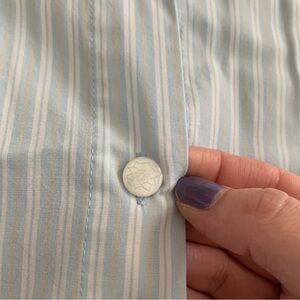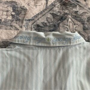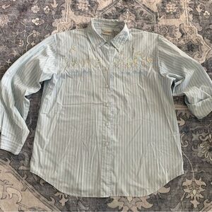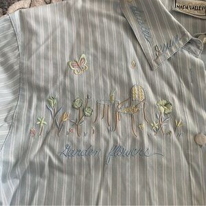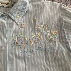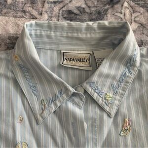 Napa Valley blue vertical striped button-down shirt. Has embroidery of flowers a garden scene. Sleeves can be either full length or rolled up. Has floral design on buttons. Size medium. Has some small discoloration flaws along the bottom hem of the shirt, please see pictures.