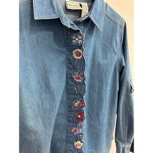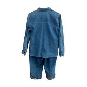 outfit set, vintage, denim set, Napa Valley, embroidered, women's fashion, floral design, casual wear, blue denim, petite size, button-up, adjustable sleeves, comfortable pants, machine washable, Hong Kong