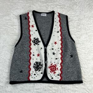 Soft knit sweater vest in grey with ivory, black and red snowflake accents and trim. Has a lovely amount of stretch. No size tag, but suggested size large from bust measurement.